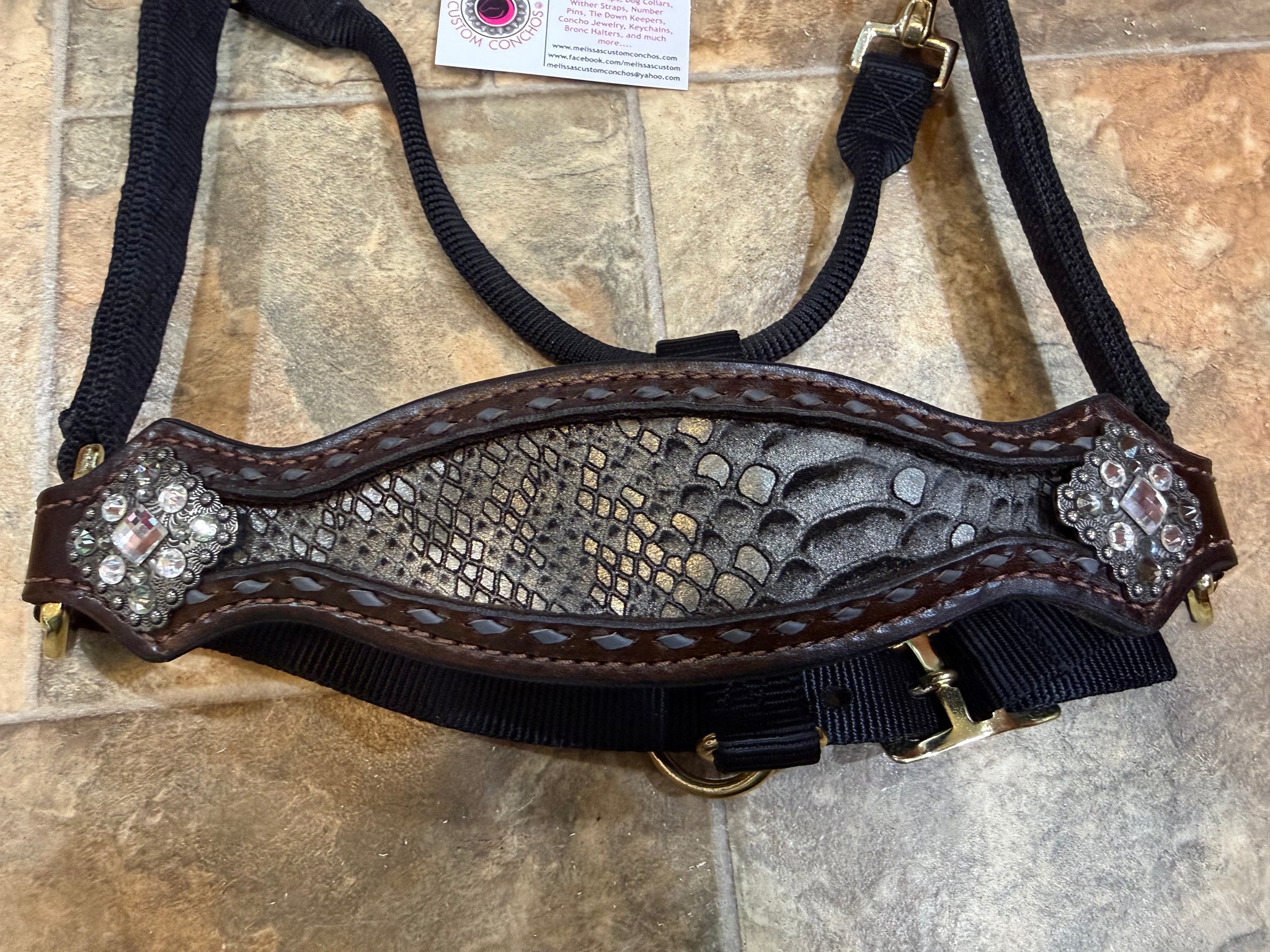 Gray/Black Mermaid overlay with Antique Silver conchos. Clear and Black Diamond crystals. Chocolate oil. GRay Buckstitch. Black Hamilton fully adjustable halter.