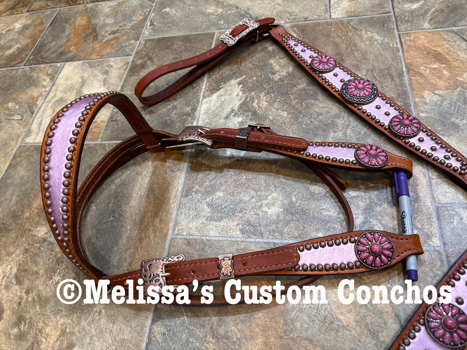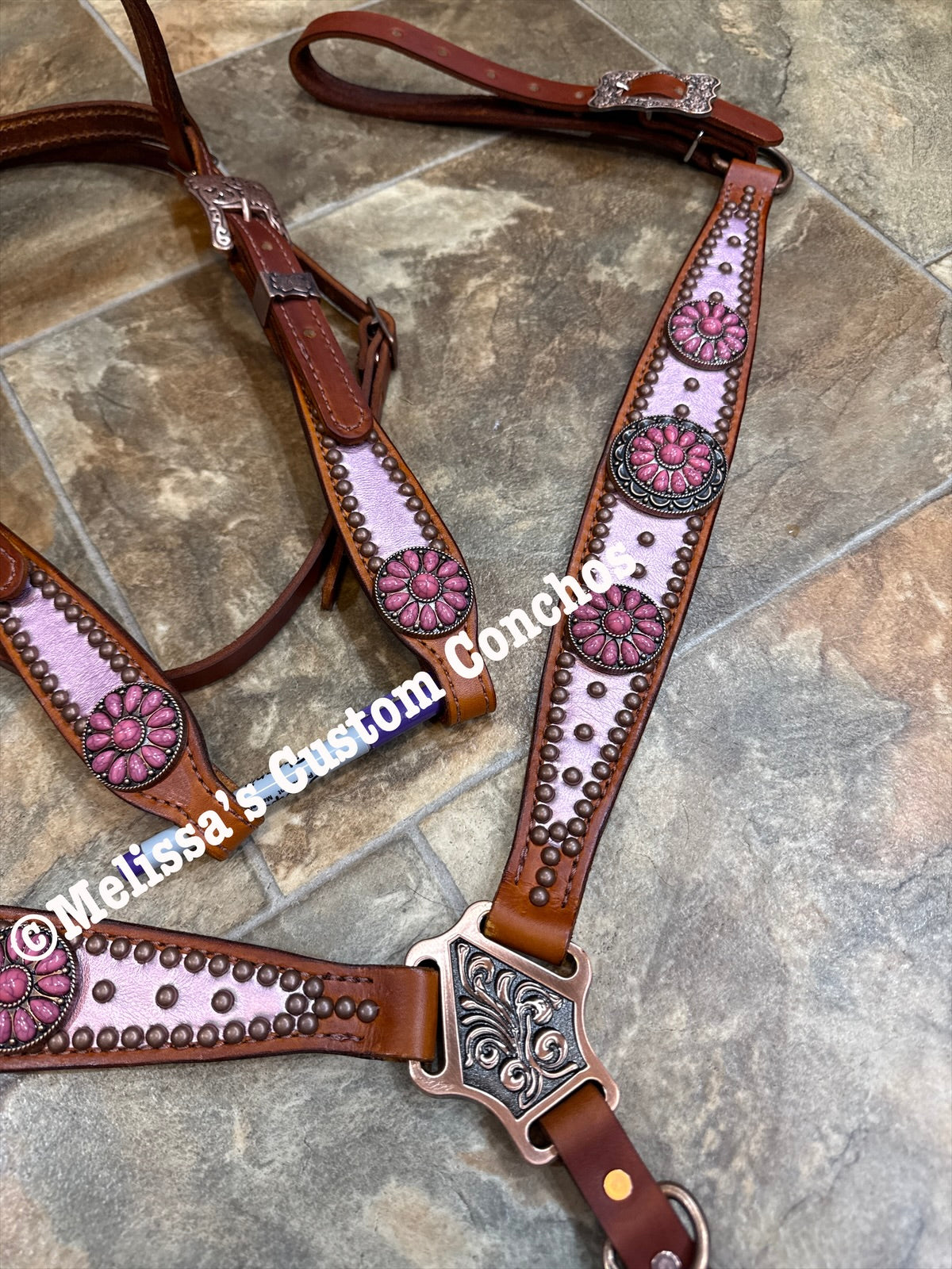 Tan oil tack set. Made by Melissa’s Custom Conchos. Light Pink Overlay. Copper Conchos and hardware. Horse size.   Browband headstall.