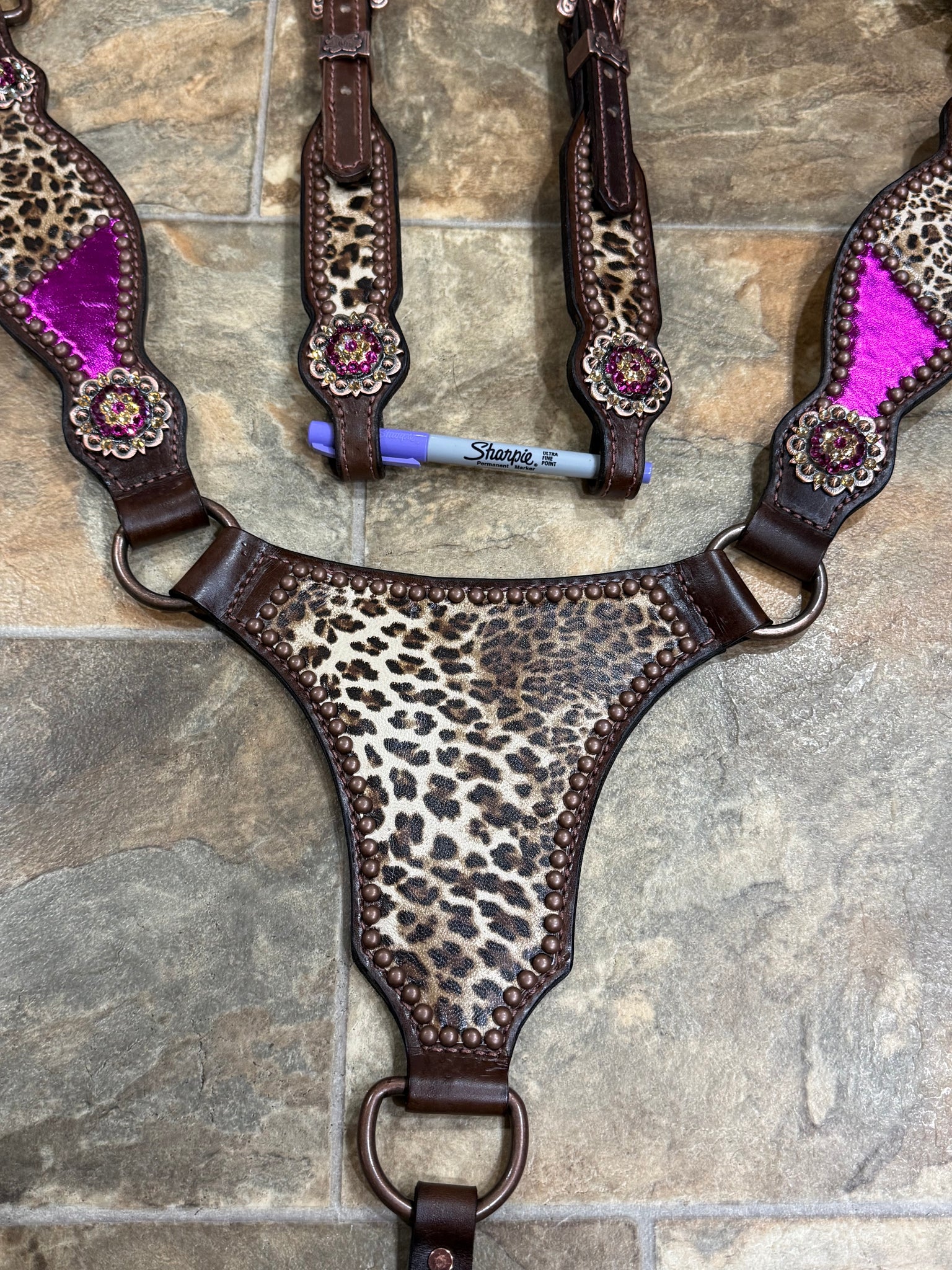 Show Brown oil tack set. Made by Melissa’s Custom Conchos. Metallic Pink and Cheetah Overlay. Copper Conchos and hardware. Fuchsia and Golden Shadow Crystals. Horse size. One ear headstall.