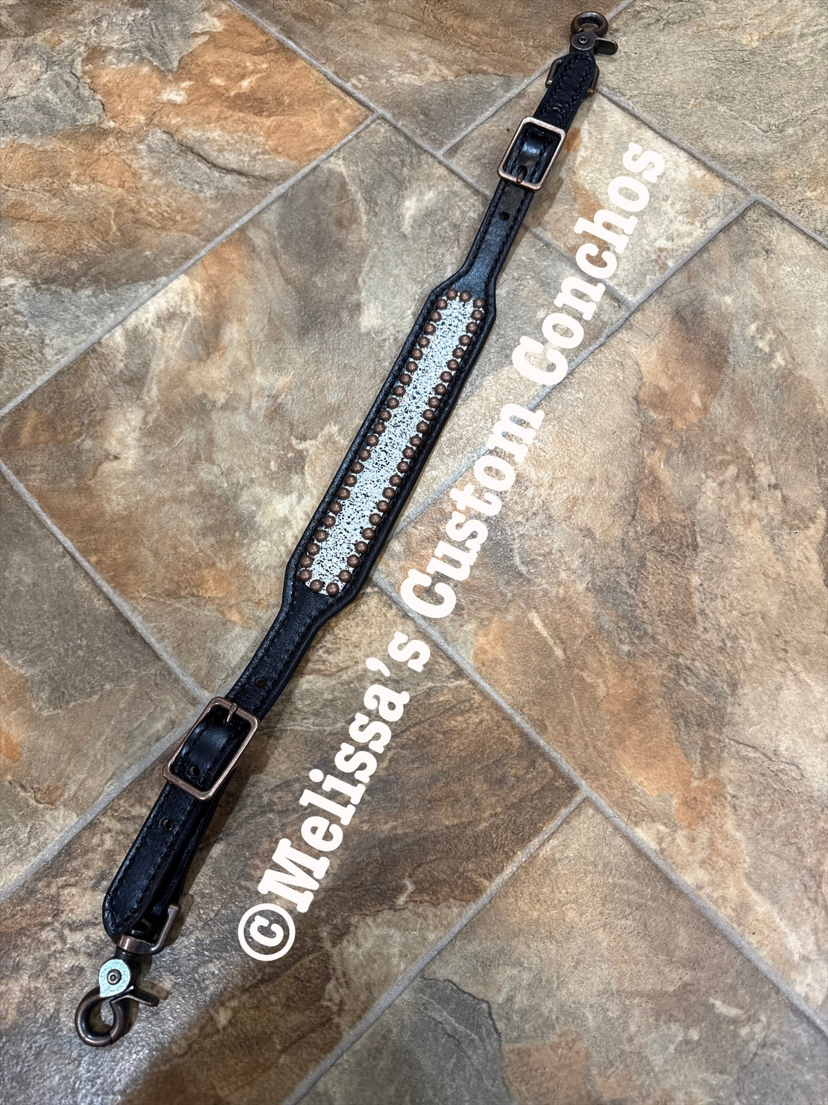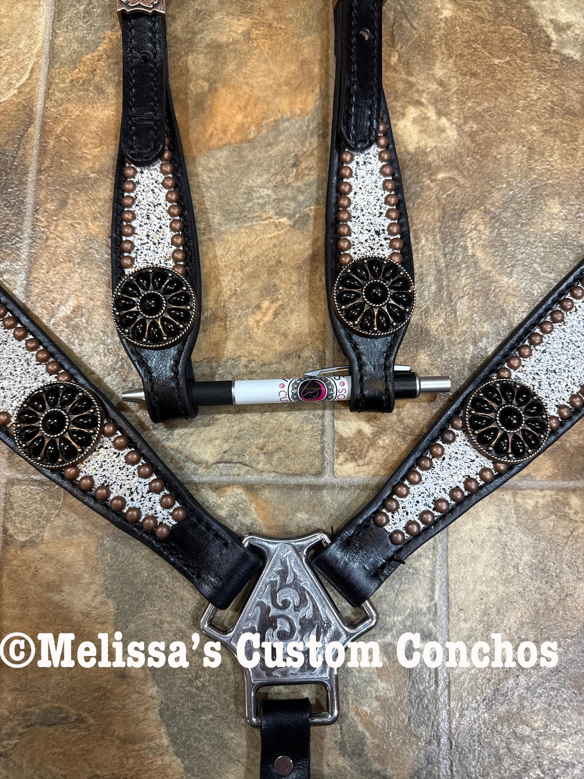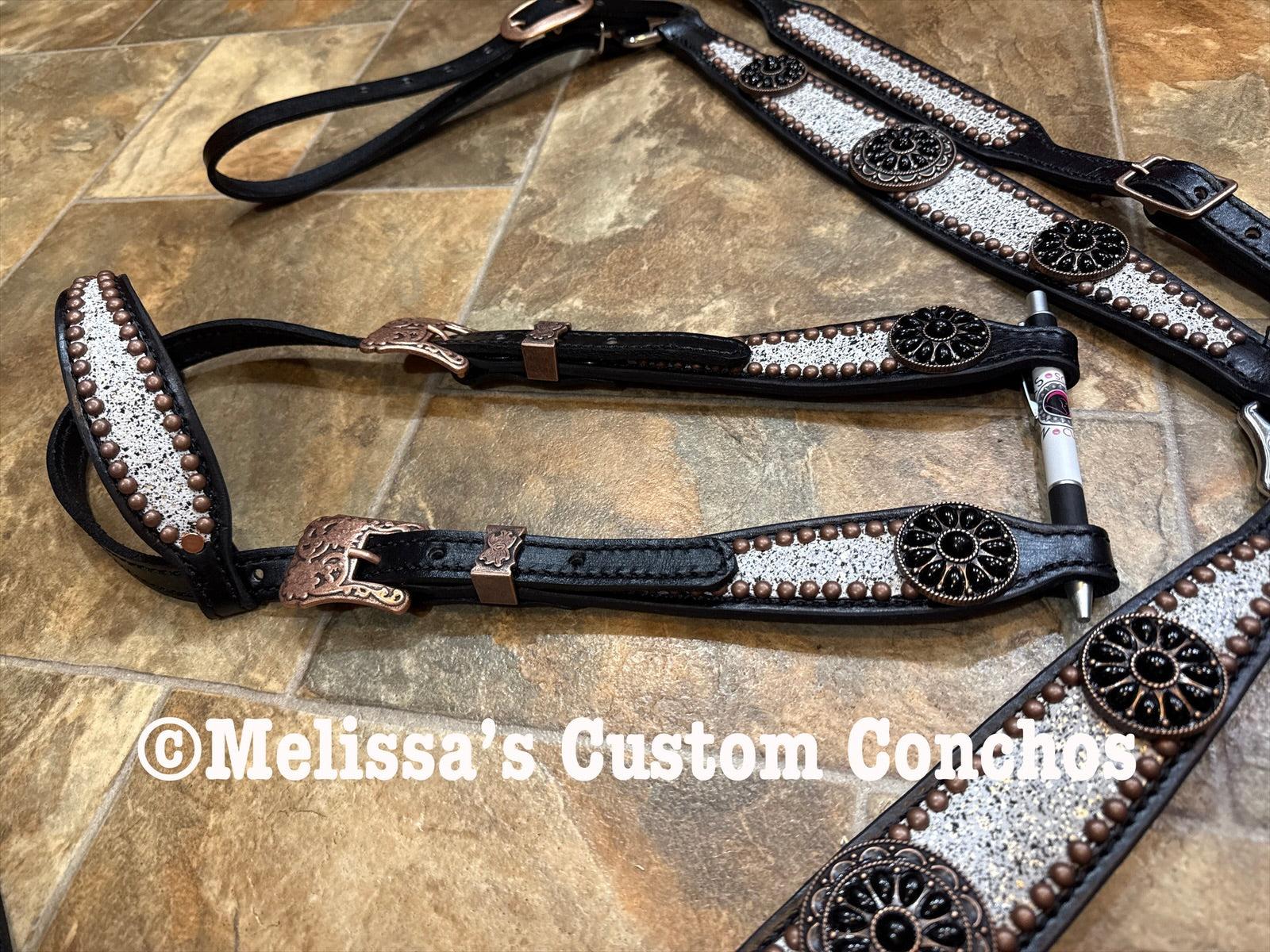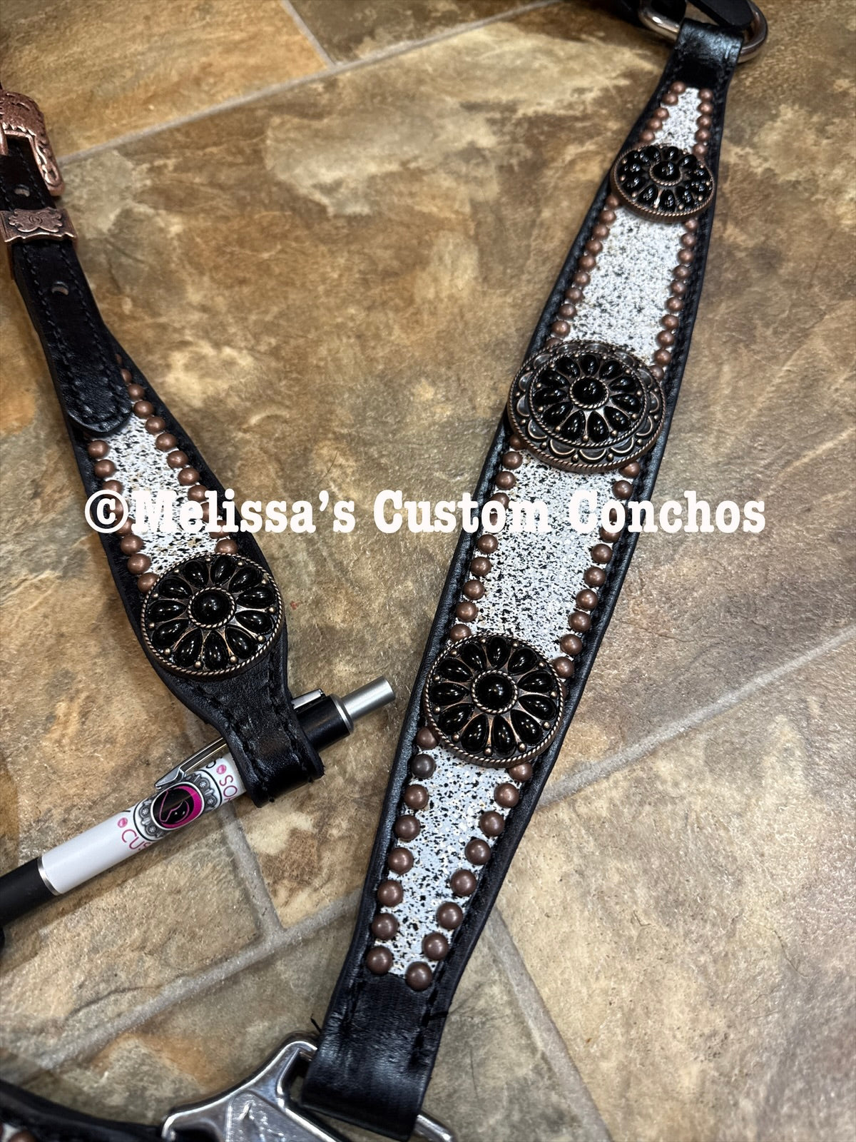 Black oil tack set. Made by Melissa’s Custom Conchos. Beach Sand Overlay with black/gold droplets. Copper Conchos and hardware. Horse size. One ear headstall.