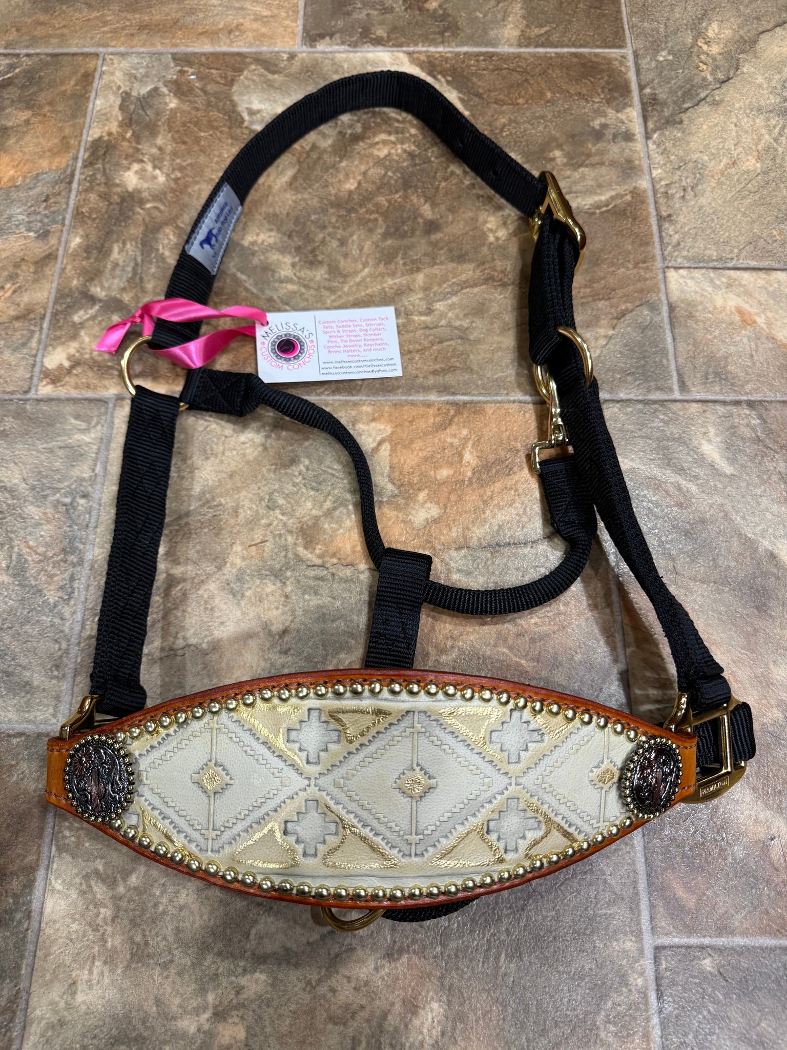 Gold Aztec overlay with Cactus conchos. Black Hamilton fully adjustable halter.