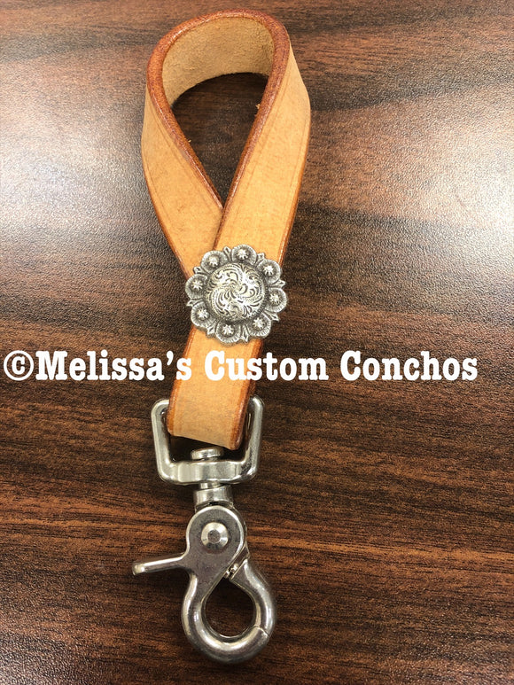 Light Oil Tie down Keeper. Antique silver concho. Comes with trigger snap.